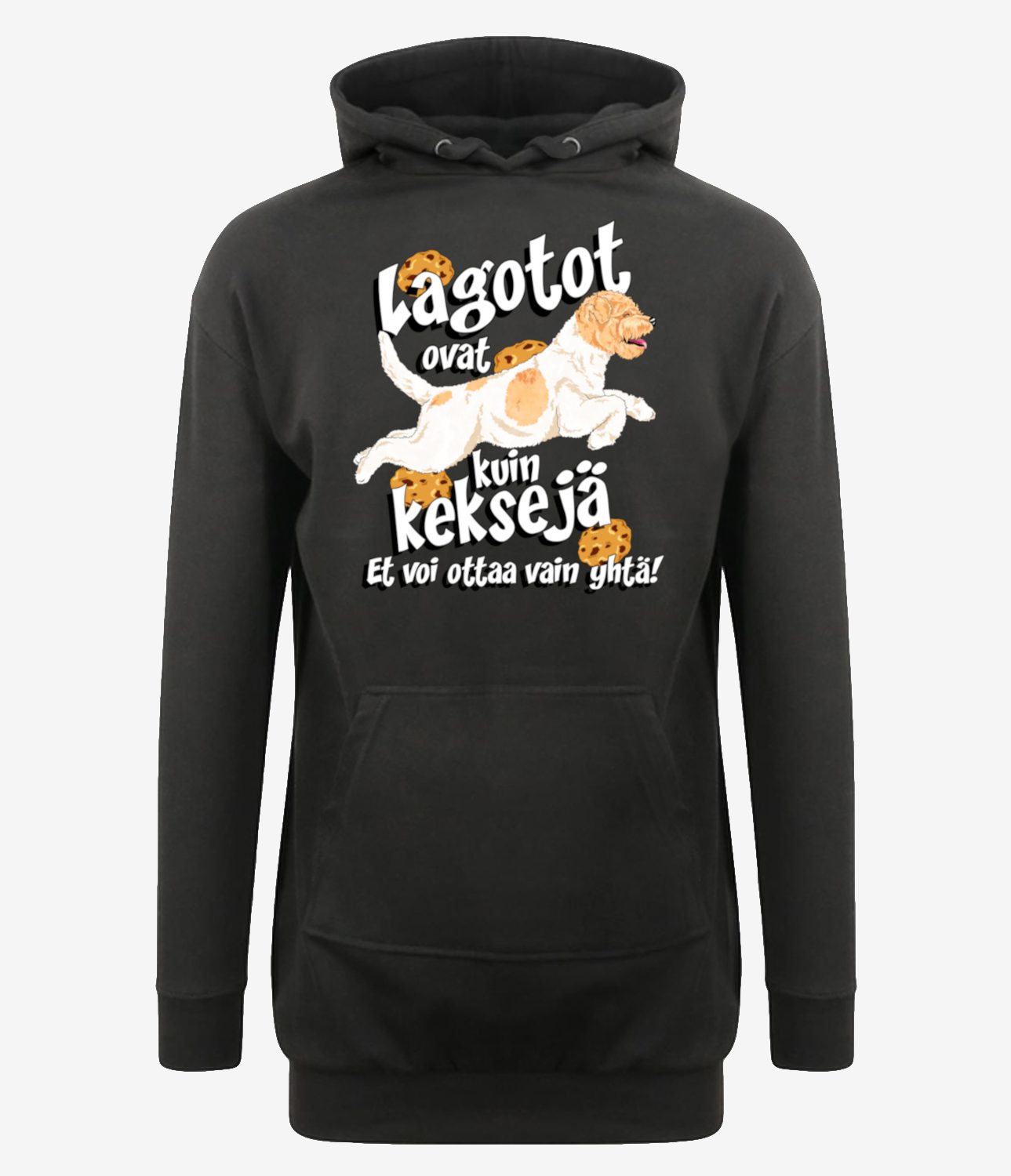 Pään yli vedettävä pehmoinen ja rento hupparimekko kengurutaskulla.