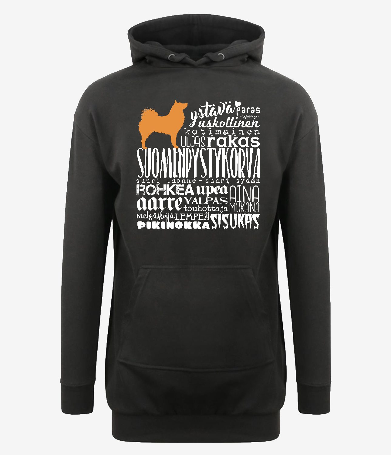 Pään yli vedettävä pehmoinen ja rento hupparimekko kengurutaskulla.